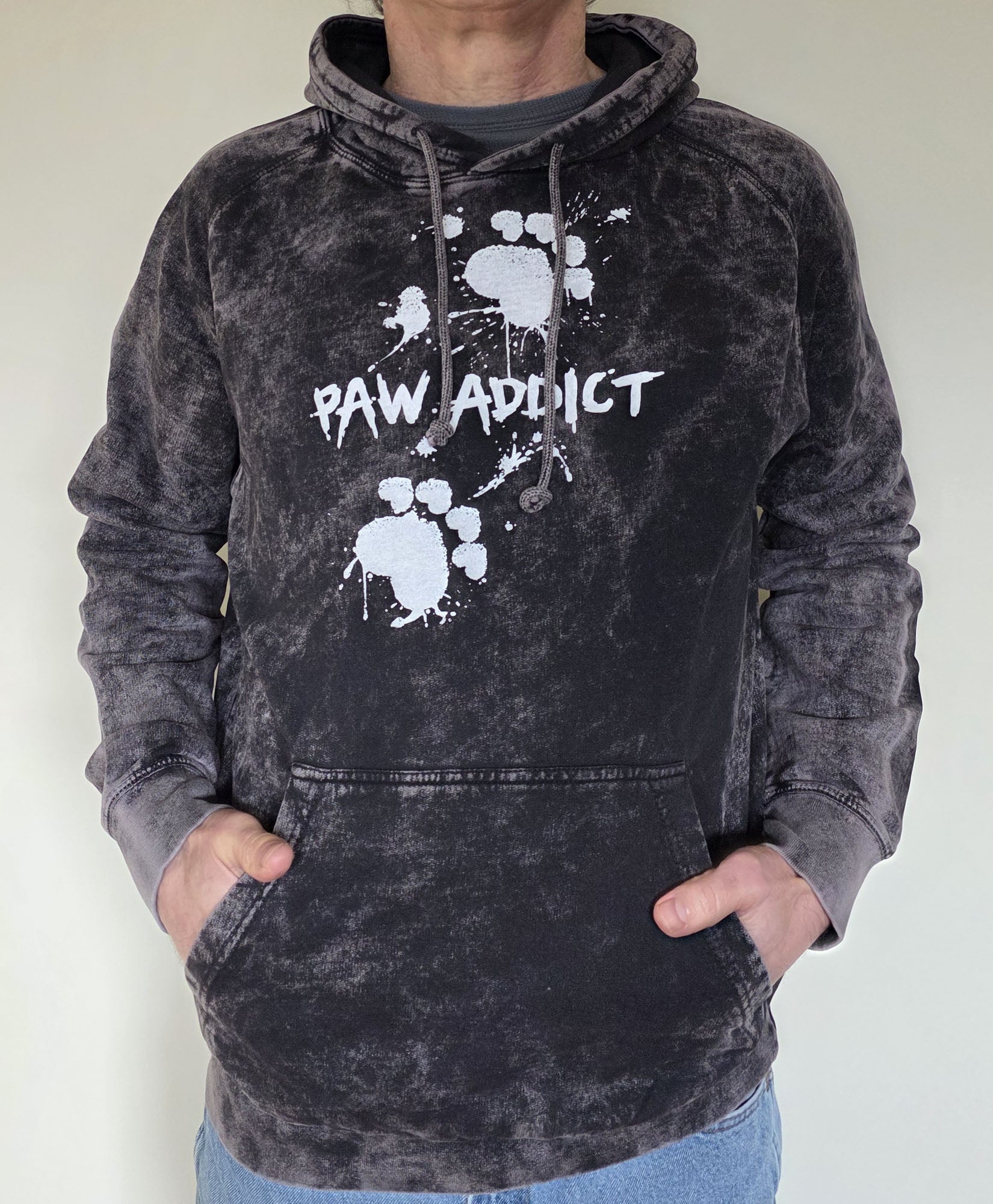 UNISEX sized hoodie made of 9 oz. 100% cotton dyed in a vintage black. Front pouch pocket and hood draw strings.  Silk screen design in soft feel ink in white. Male model is 5 ft 10 inches,155 pounds and wearing size large. He's the same dude in the wolf costume video.